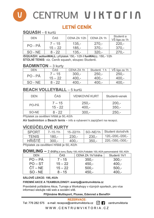 Pro rezervaci sportovišť volejte: 776 282 575 Pro rezervaci bowlingu volejte: 776 282 575 Pro rezervaci místa v restauraci volejte: 777 792 881 |